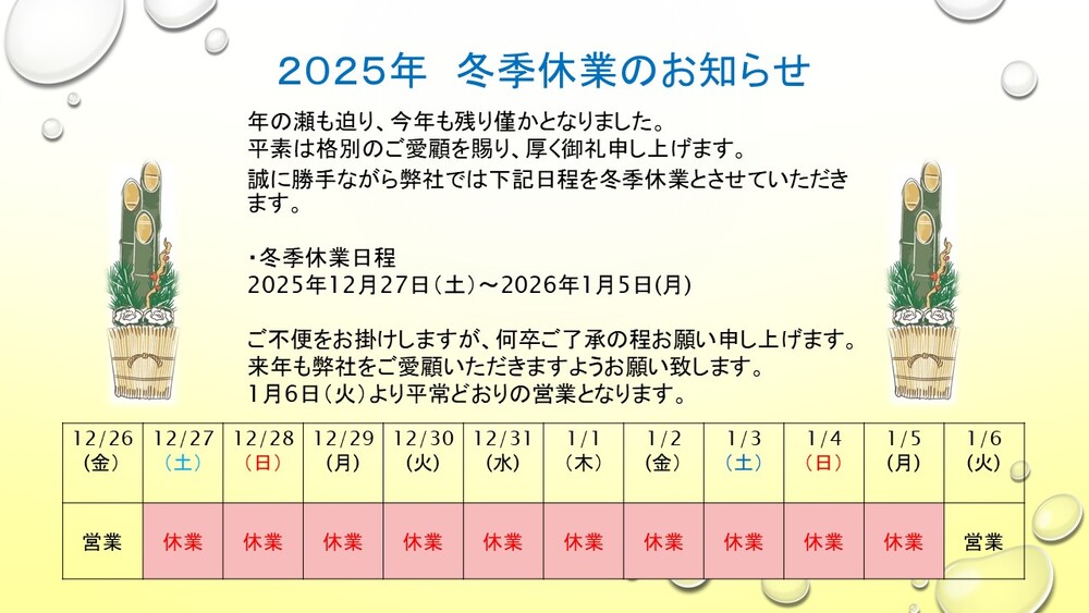 本日2026年1月6日より平常通りの営業となります。