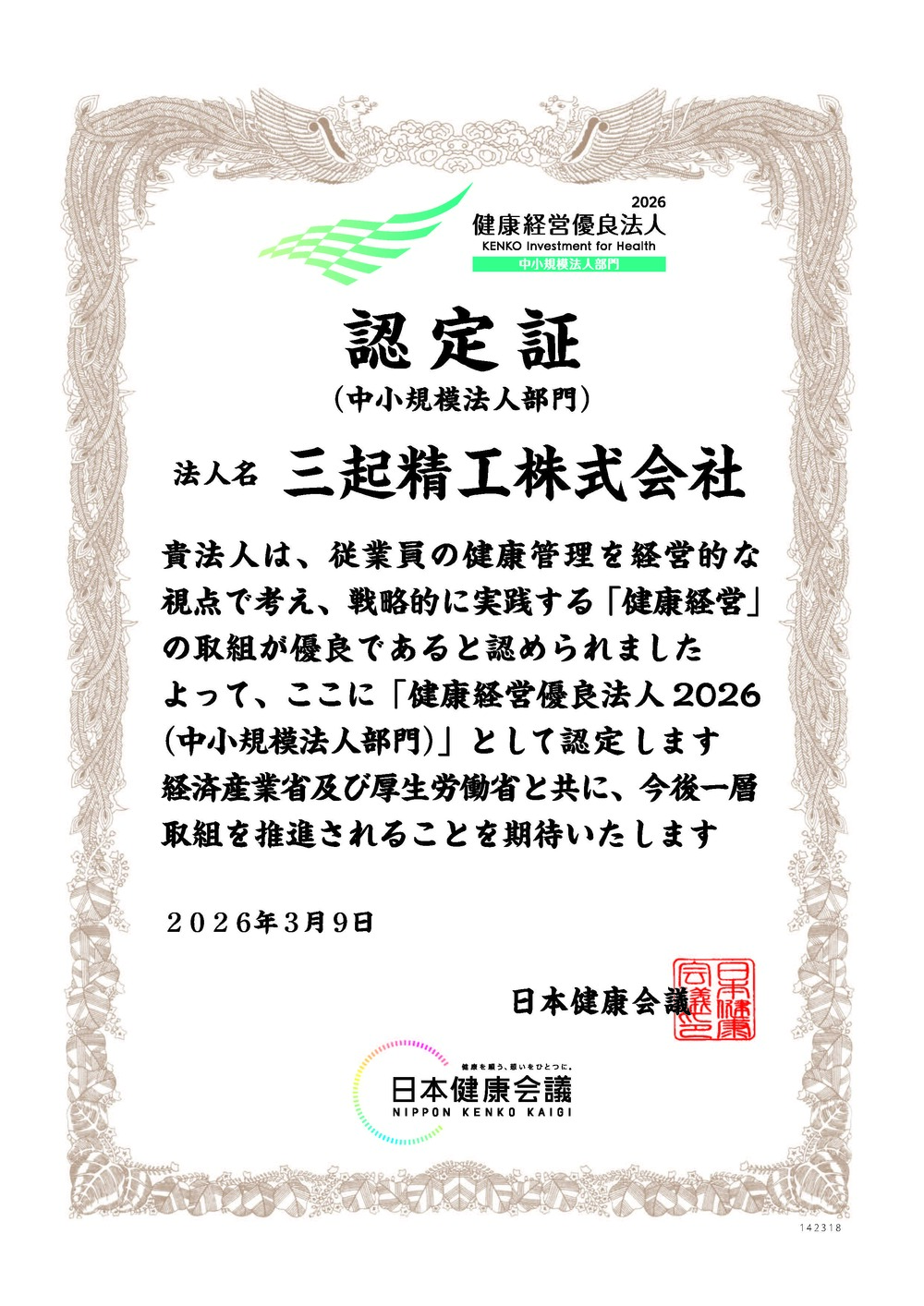 この度三起精工株式会社は、日本健康会議が認定する『健康経営優良法人2026(中小規模法人部門)』に認定されました。