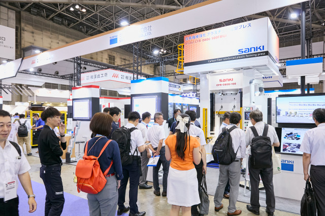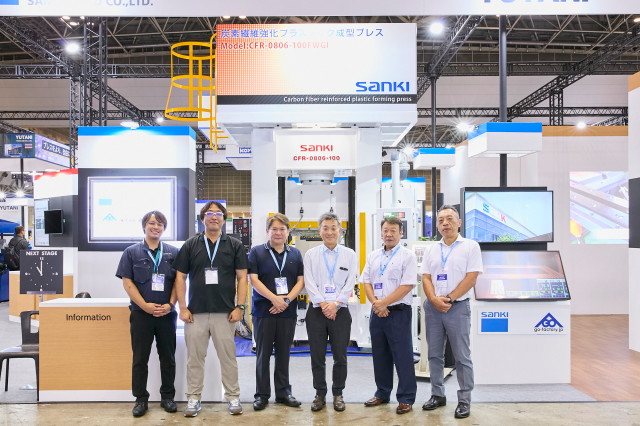 今回の展示会では、CFRP(炭素繊維強化プラスチック)の加工に対応したCFRP成形プレスに、株式会社郷製作所様のGMS(複合材料成形システム)を取り付けた最新の実機を共同出展致しました。